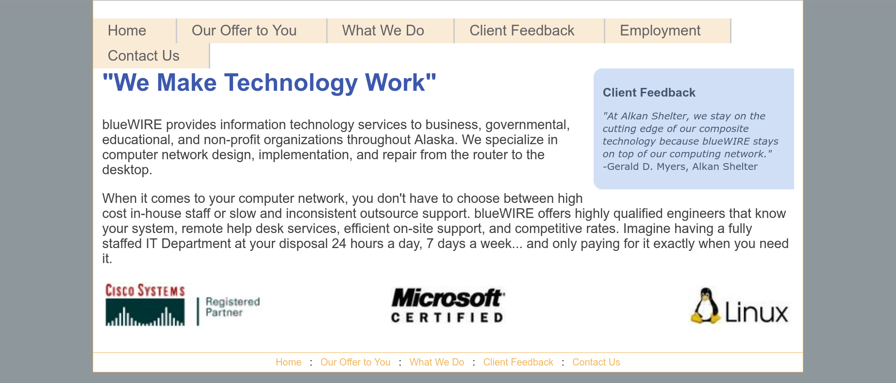 blueWIRE provides information technology services to business, governmental, educational, and non-profit organizations throughout Alaska. We specialize in computer network design, implementation, and repair from the router to the desktop.